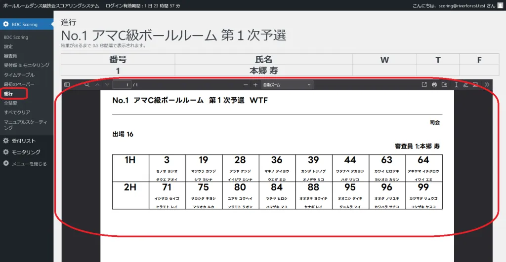 - 受付係にモニタリング機能を付加し、最大6端末から競技の進行を監視できます。進行競技のヒートペーパーが表示されます。これによりペーパーレスの競技進行ができます。セクションを選択すると、結果と次のヒートを見る事ができます。