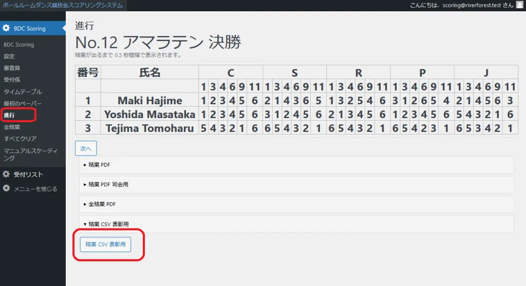 2.「進行」の「結果 CSV 表彰用」をクリックし、ファイルを保存する