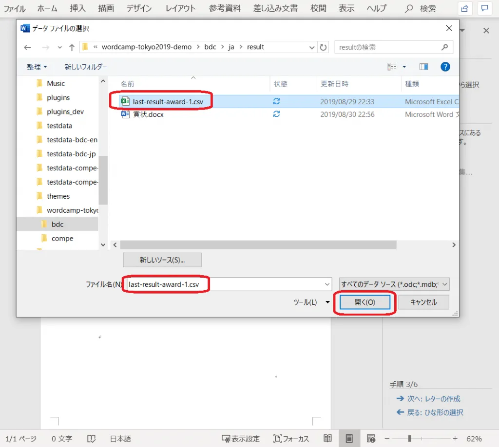 19.「差し込みフィールドの挿入」をクリックし、「開催年月日」を挿入する