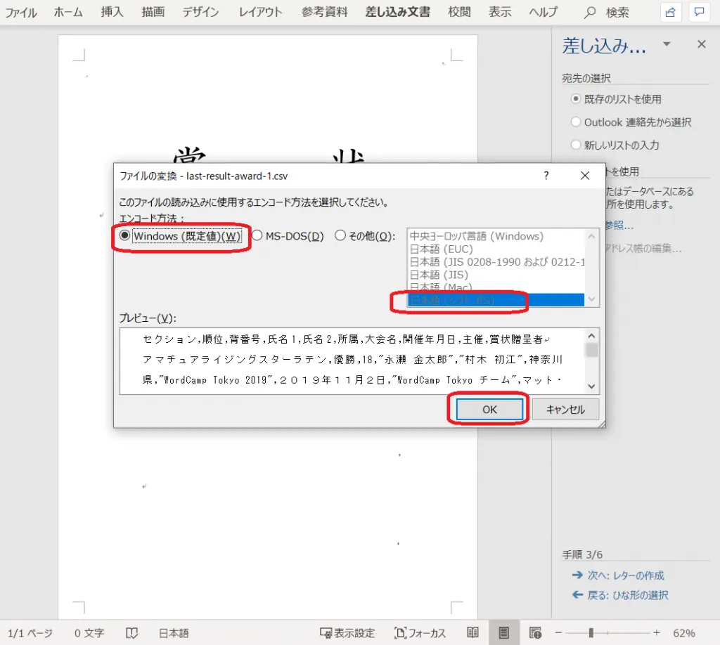 10.Windows(規定値)、日本語(シフトJIS)、で OK をクリックする