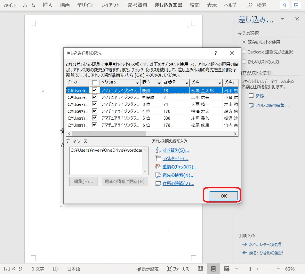 24.新規文書に、以下の場合はデータ6個分が差し込まれる