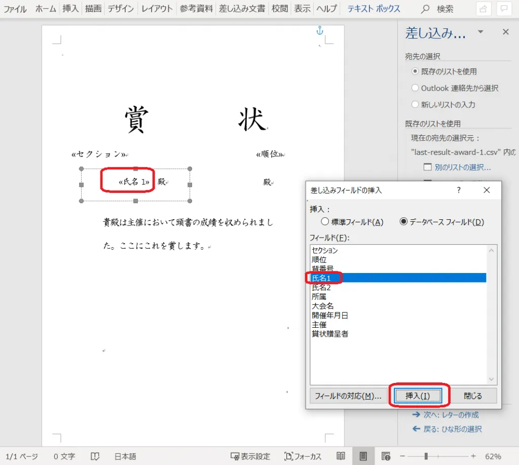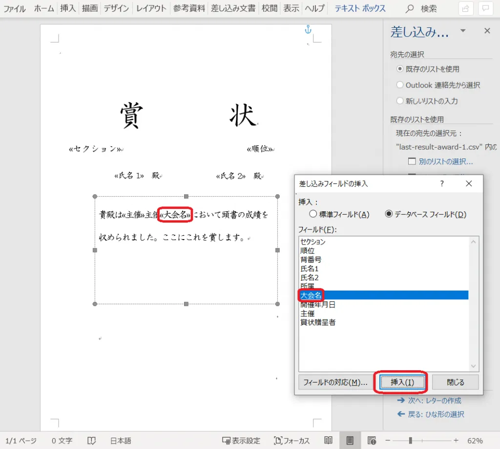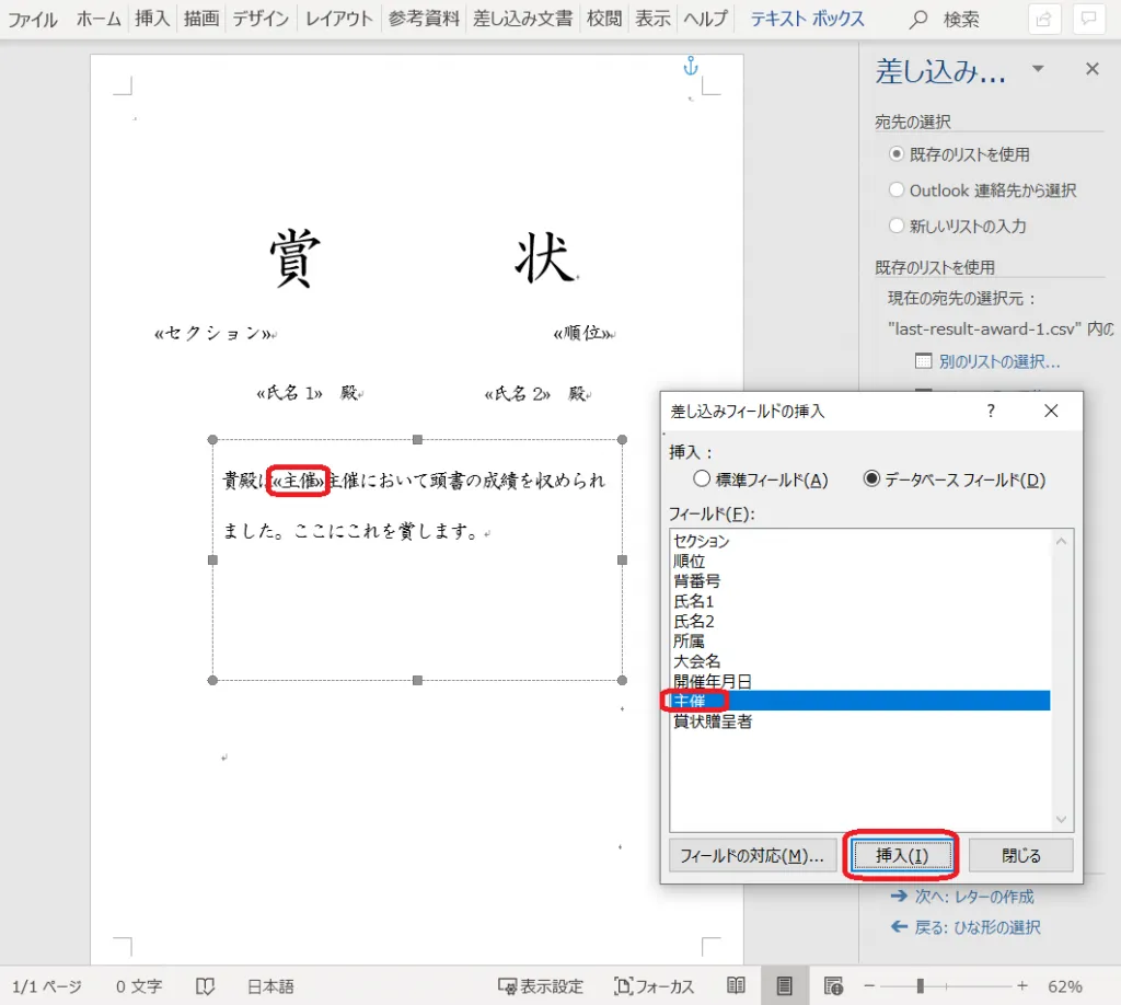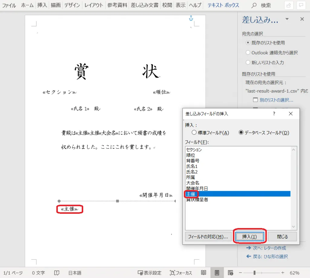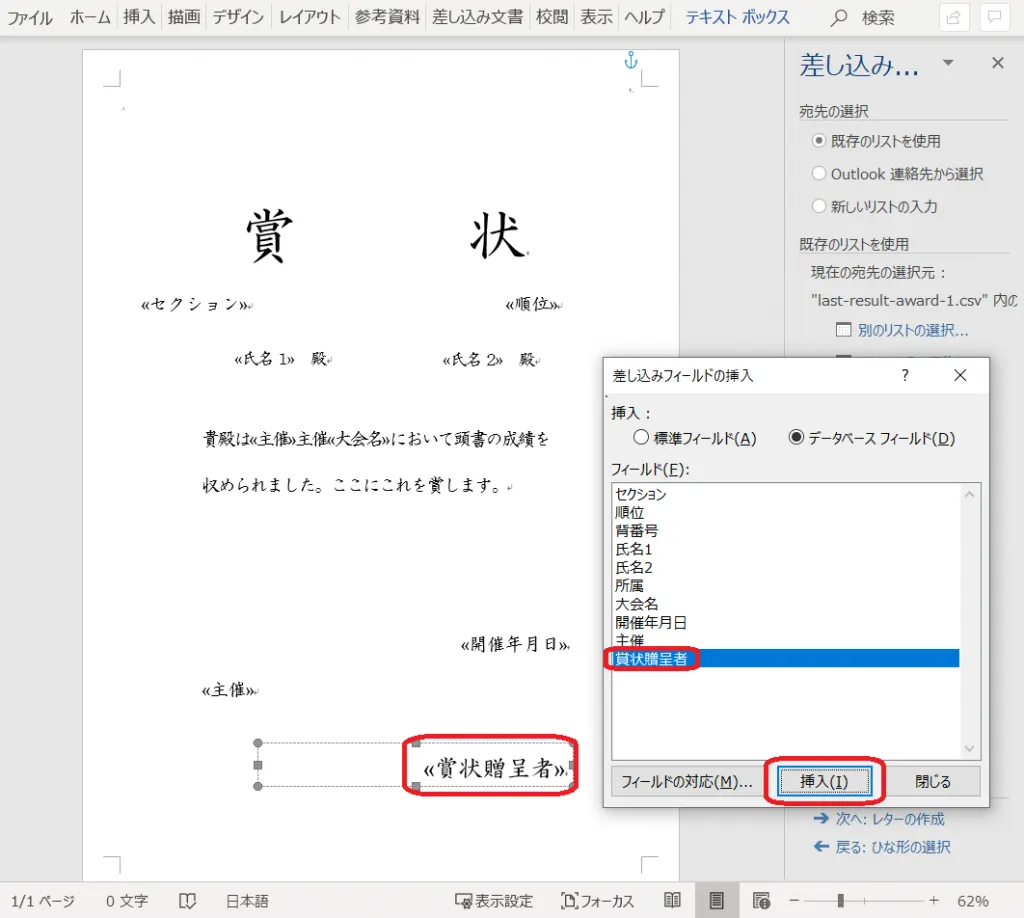 21. 「差し込みフィールドの挿入」をクリックし、「賞状贈呈者」を挿入する