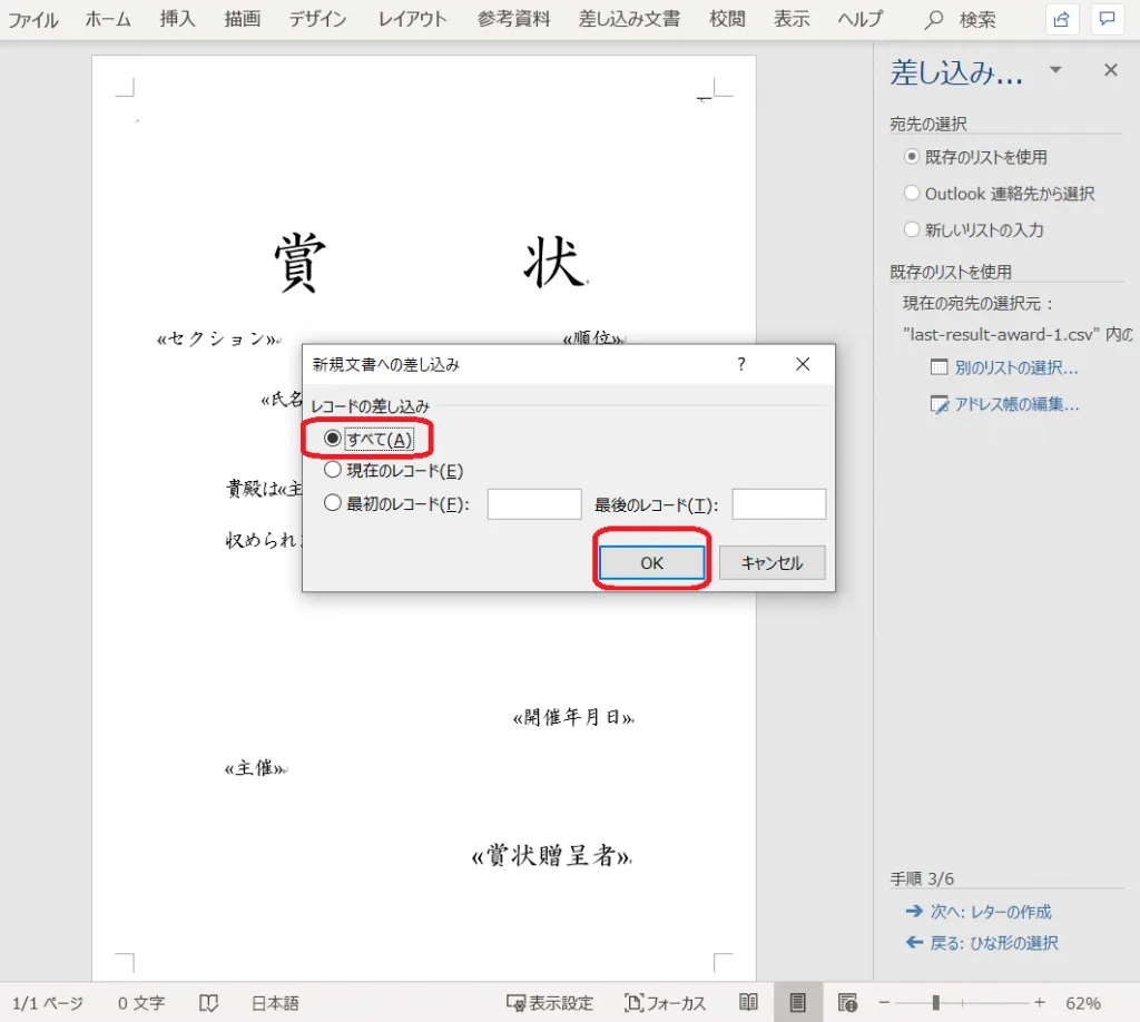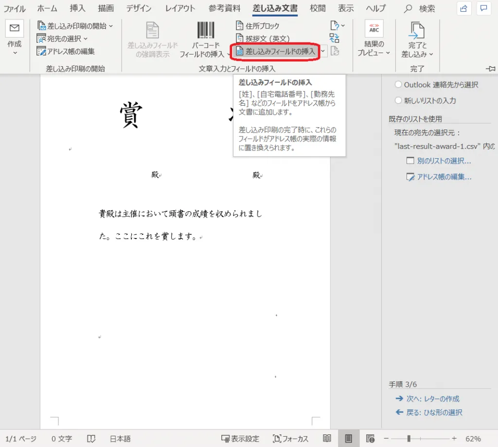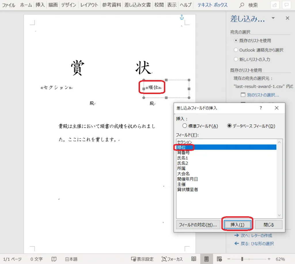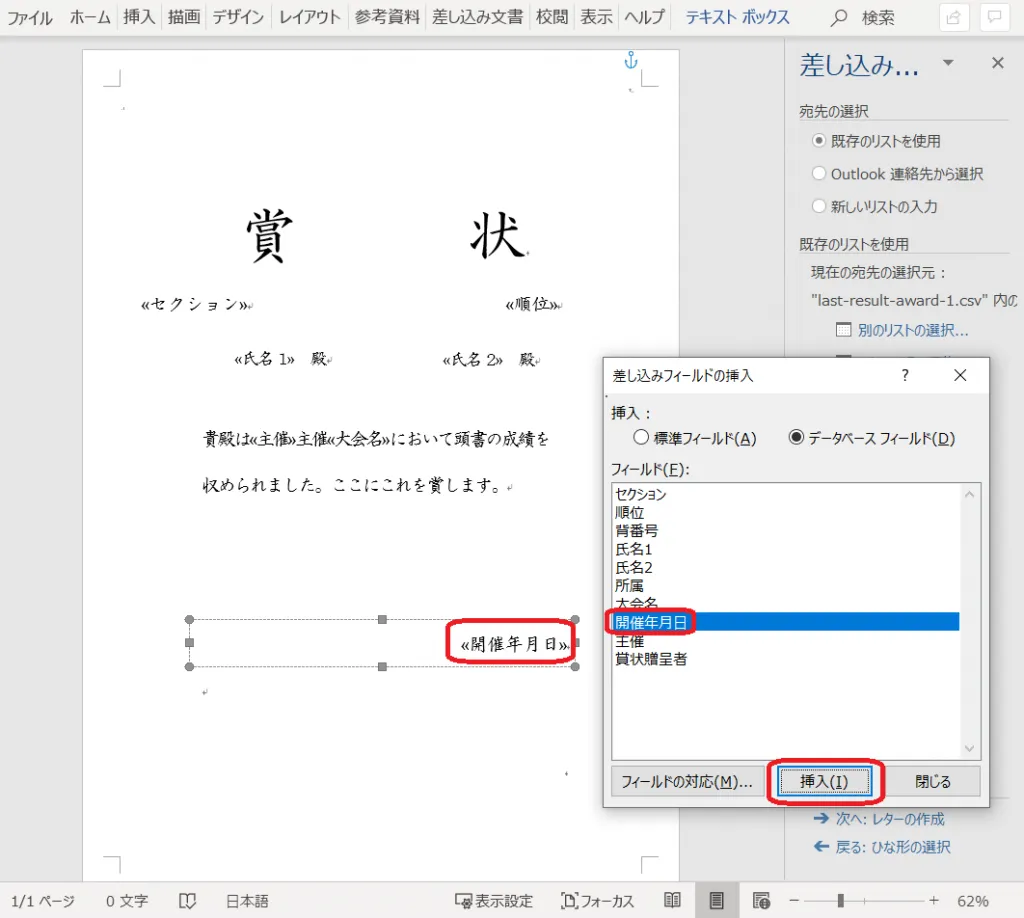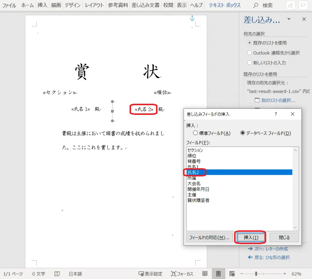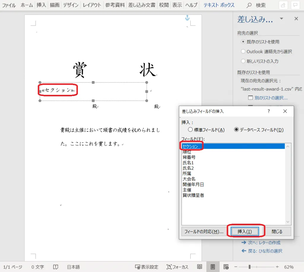 21. 「差し込みフィールドの挿入」をクリックし、「賞状贈呈者」を挿入する