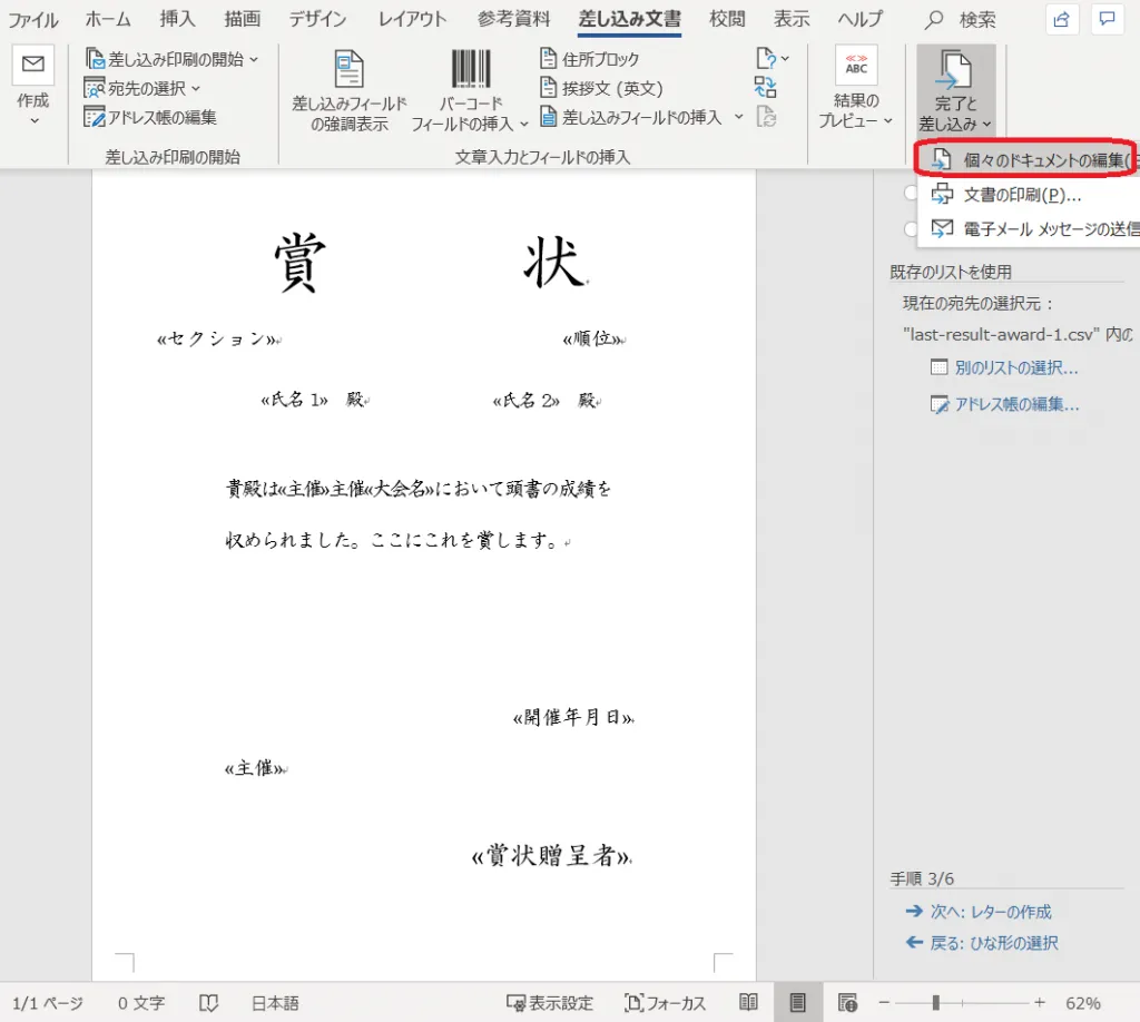 22.「完了と差し込み」の「個々のドキュメントの編集」をクリックする