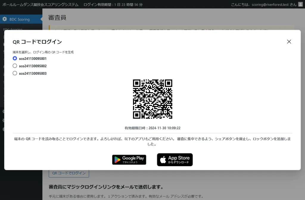 1.QRコードでログイン:手元に端末がある場合に使用します。審査員データのメールアドレスは、架空のものを使用できます。端末のQRコード読み取りアプリでQRコードを表示させて読み取るとログインします。この方法以外でログインする場合には、2以降を参照してください。QRコード読み取りアプリは一般的なものを使用できますが、このシステム用に以下のアプリを用意しました。審査に集中できるよう、シェアボタンを廃止し、ロックボタンを追加しています。