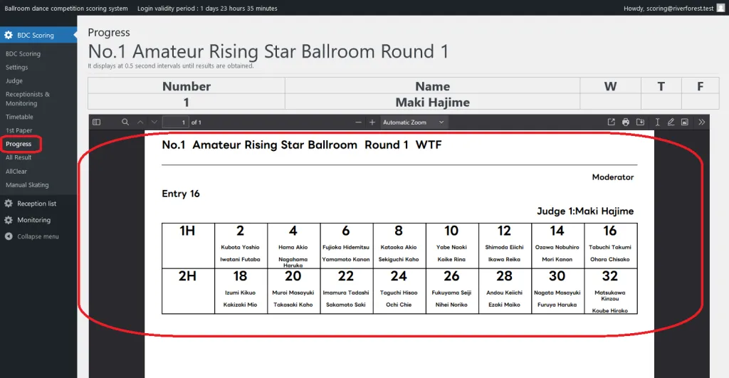 - A monitoring function is added to the receptionist to monitor the progress of the competition from up to 6 terminals. Heat paper of the progression competition is displayed. This allows paperless competition progression. When a section is selected, the results and the next heat can be viewed.